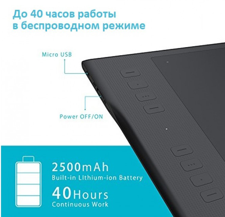 Дополнительно: Чувствительность к наклону пера 60 уровней Технология: электромагнитный резонанс Количество Express клавиш: 8 Минимальная высота работы пера: 10 мм Энергопотребление: 12 В Поддержка систем: Windows 7/8/8.1/10, MAC OS X10.11 и выше Емкость аккумулятора: 2500 мАч