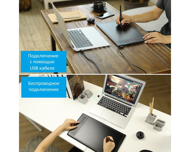 Комплектация: Графический планшет Ручка без батареи Беспроводной приемник Микро USB-кабель Держатель ручки Ручки пера х 10 (внутри держателя ручки) Зажим для кончика (внутри держателя ручки) Инструкция по началу работы